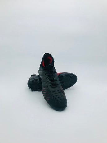 The Adidas Predator 19.3 football boots are designed for firm ground play. These boots feature a synthetic upper and a sock-like construction for a close, secure fit. The design aims to provide players with enhanced ball control and stability during gameplay. The black and red colorway offers a classic, sporty aesthetic. Appear to be in like-new condition with minimal wear.