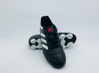 Adidas Goletto Firm Ground boots are designed for reliable performance on natural firm ground surfaces. They feature a durable synthetic upper in Core Black, Cloud White, and Solar Red, combined with traditional conical studs for traction. In good condition, these boots show minor scuffing and slight dirt on the white soleplate studs, while the synthetic upper remains clean with minimal creasing. They offer a straightforward, durable option for firm ground play.
