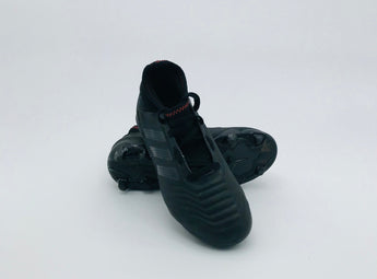 The Adidas Predator 18.1 FG football boots, in Core Black/Red, are designed for enhanced ball control on firm ground. They feature a synthetic upper with textured strike zones and a laceless or concealed-lace construction. A comfortable Primeknit collar and a durable TPU outsole provide optimal traction on natural grass pitches. These boots are in good used condition.