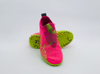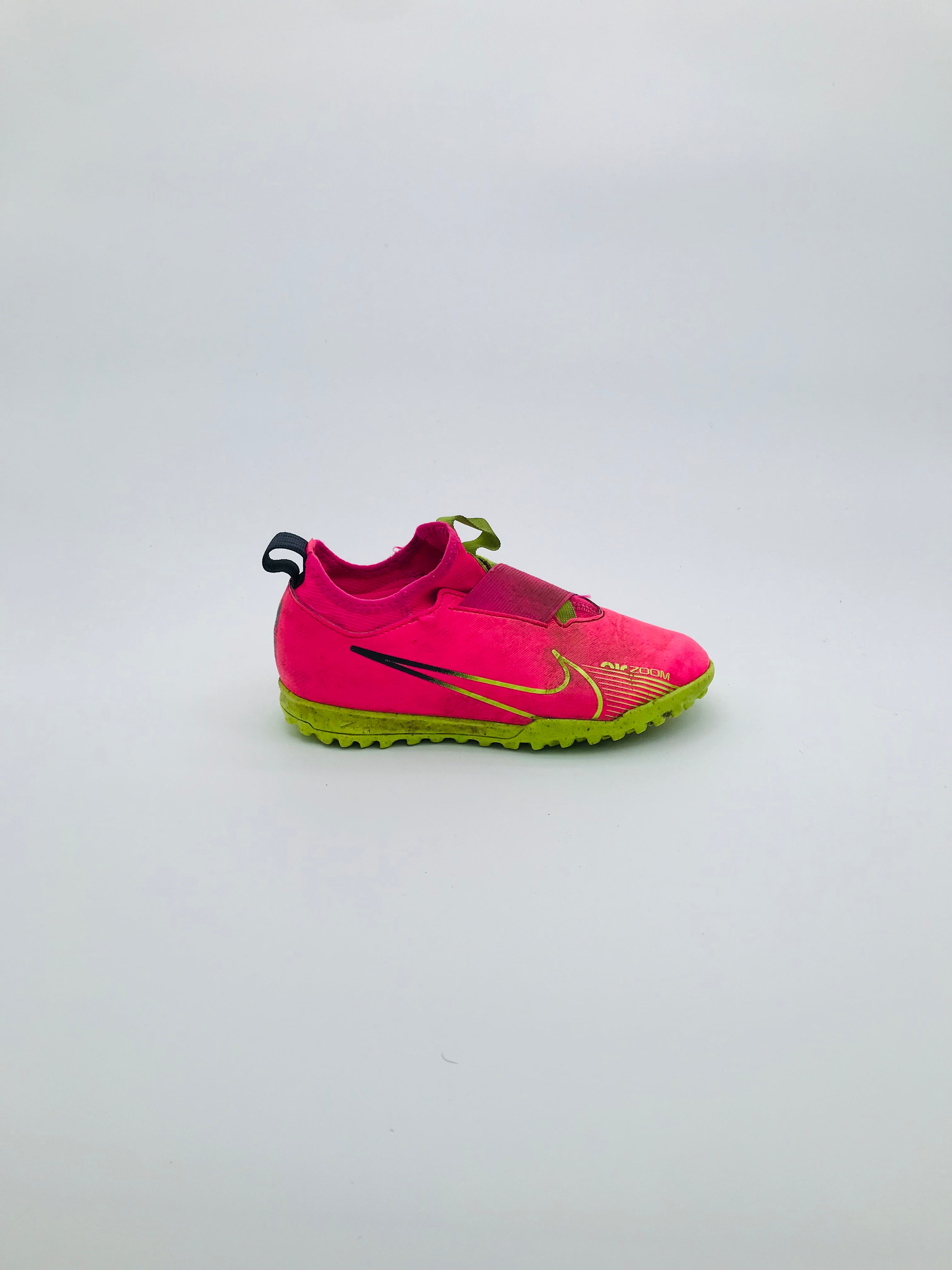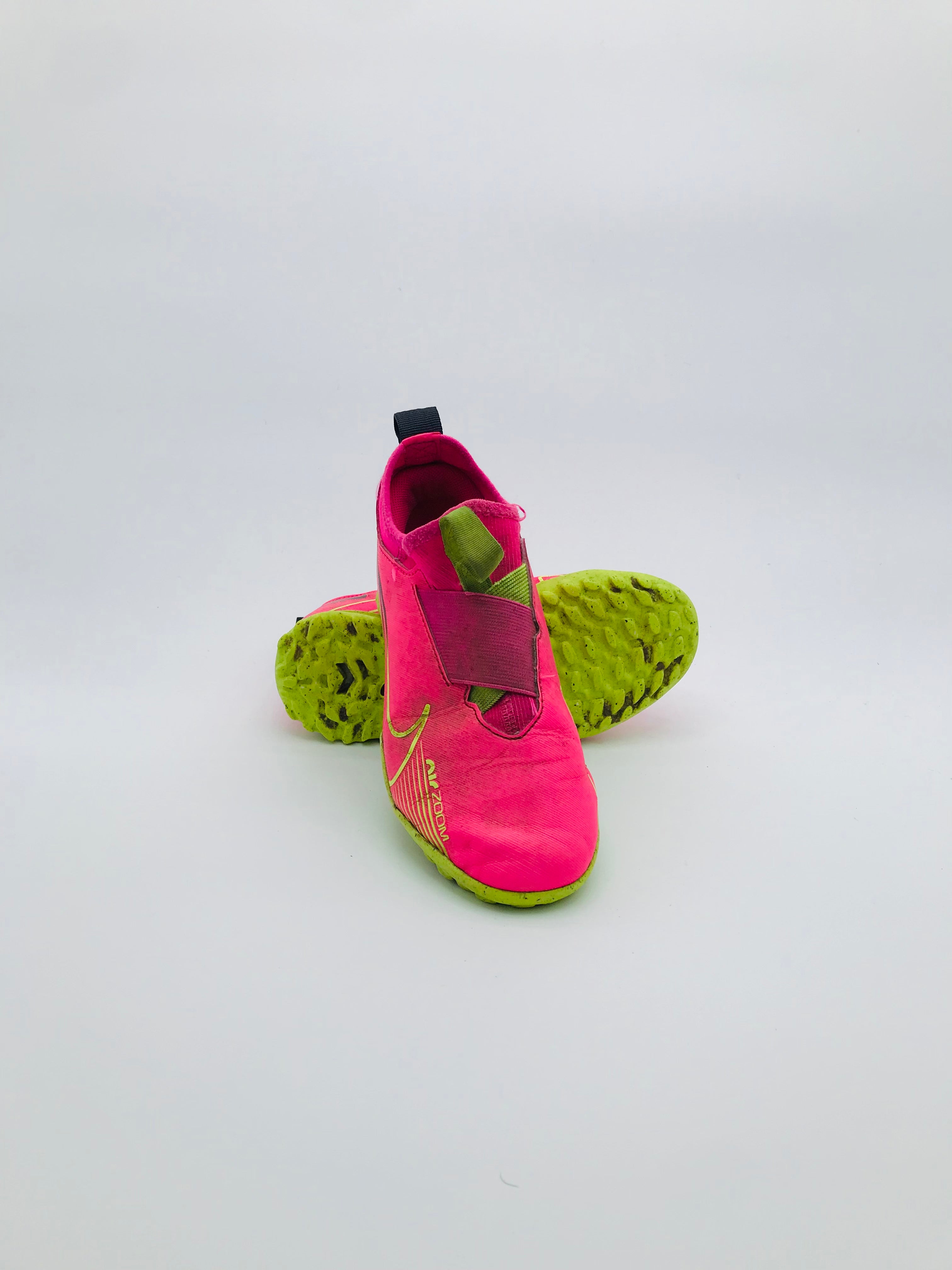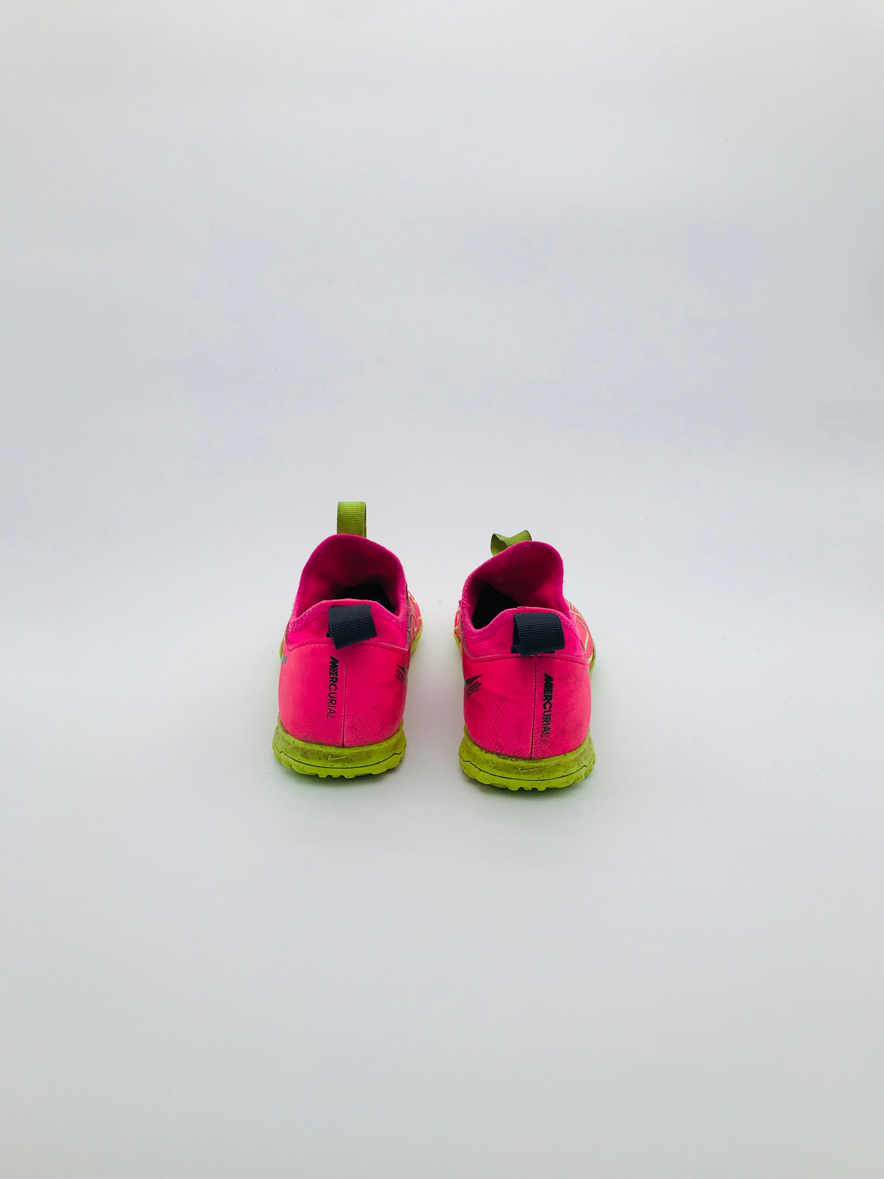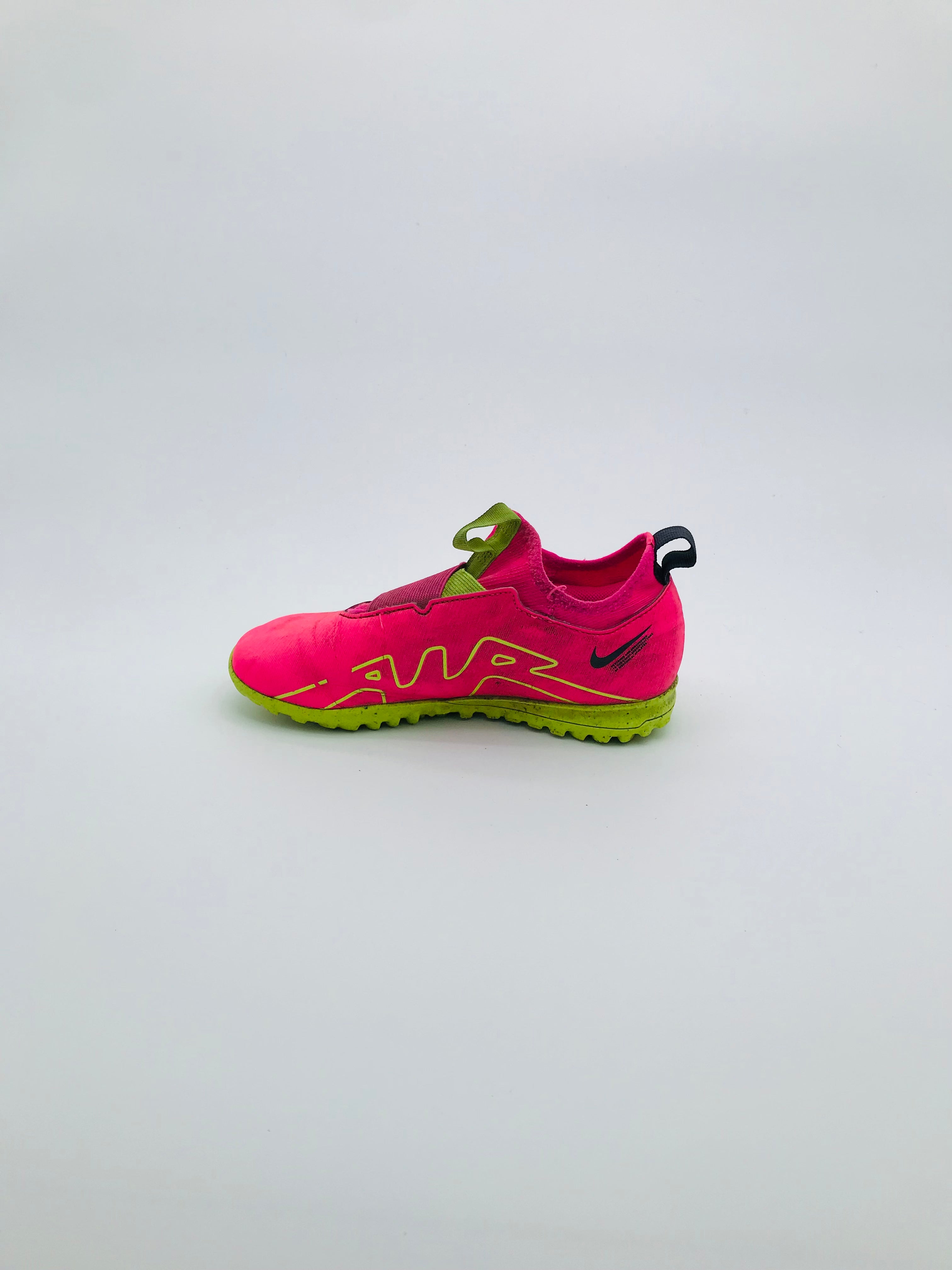 The Nike Jr. Mercurial Superfly 9 Academy TF football trainers are designed for youth players seeking speed and agility on artificial turf. These laceless shoes feature a vibrant pink synthetic upper with a midfoot strap for a secure fit. Visible dirt and scuffs are present on the upper, particularly the toe box. The volt (lime green) rubber outsole shows wear consistent with turf use. 'AIR ZOOM' branding has minor wear.