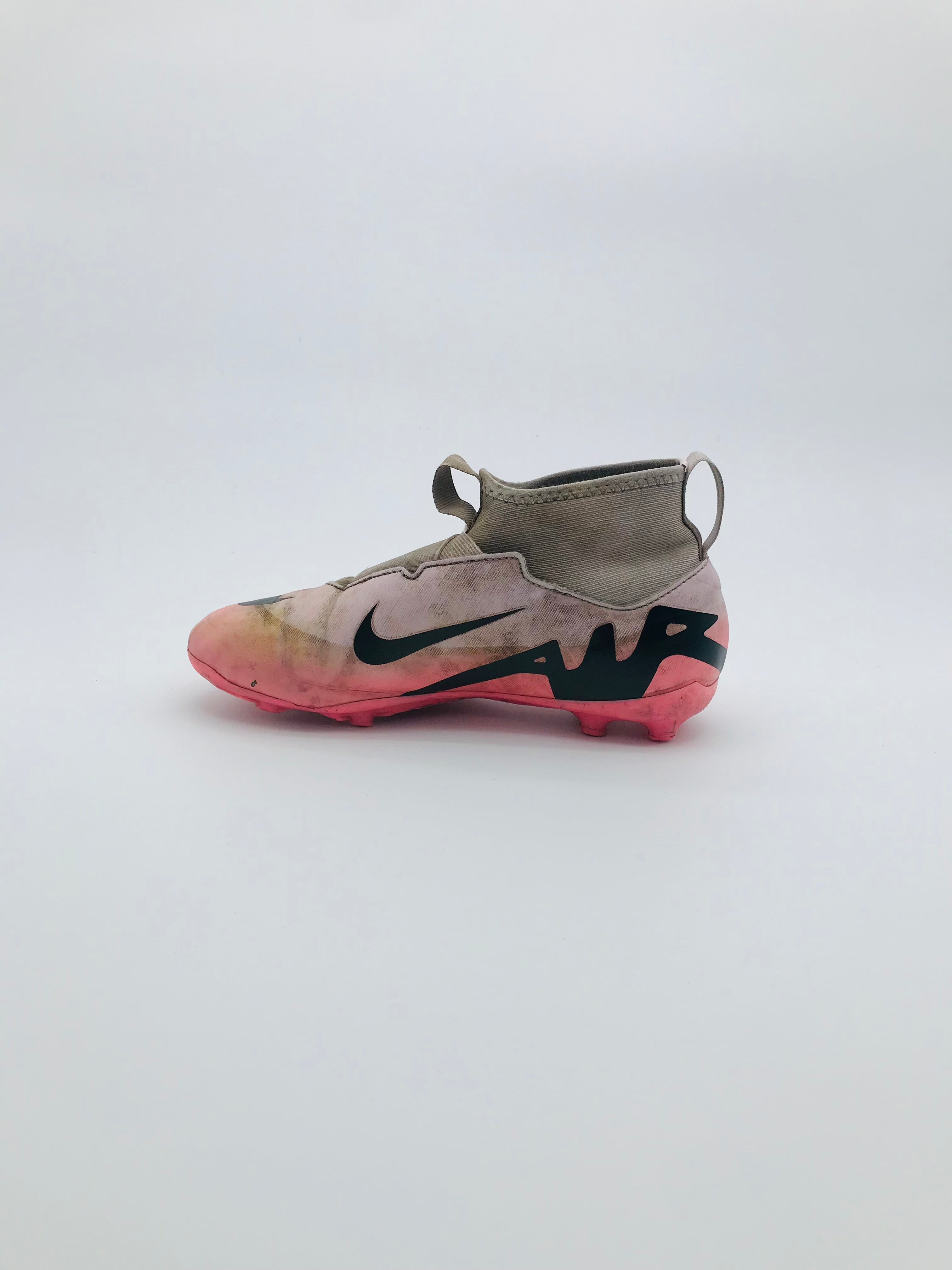 Nike Mercurial Vapor 13 Elite FG soccer cleats built for speed and agility on firm ground surfaces. Constructed with a synthetic upper material. Condition is fair, with visible dirt and stains and some wear on the soleplate. These boots are designed to help players achieve high speed performance.