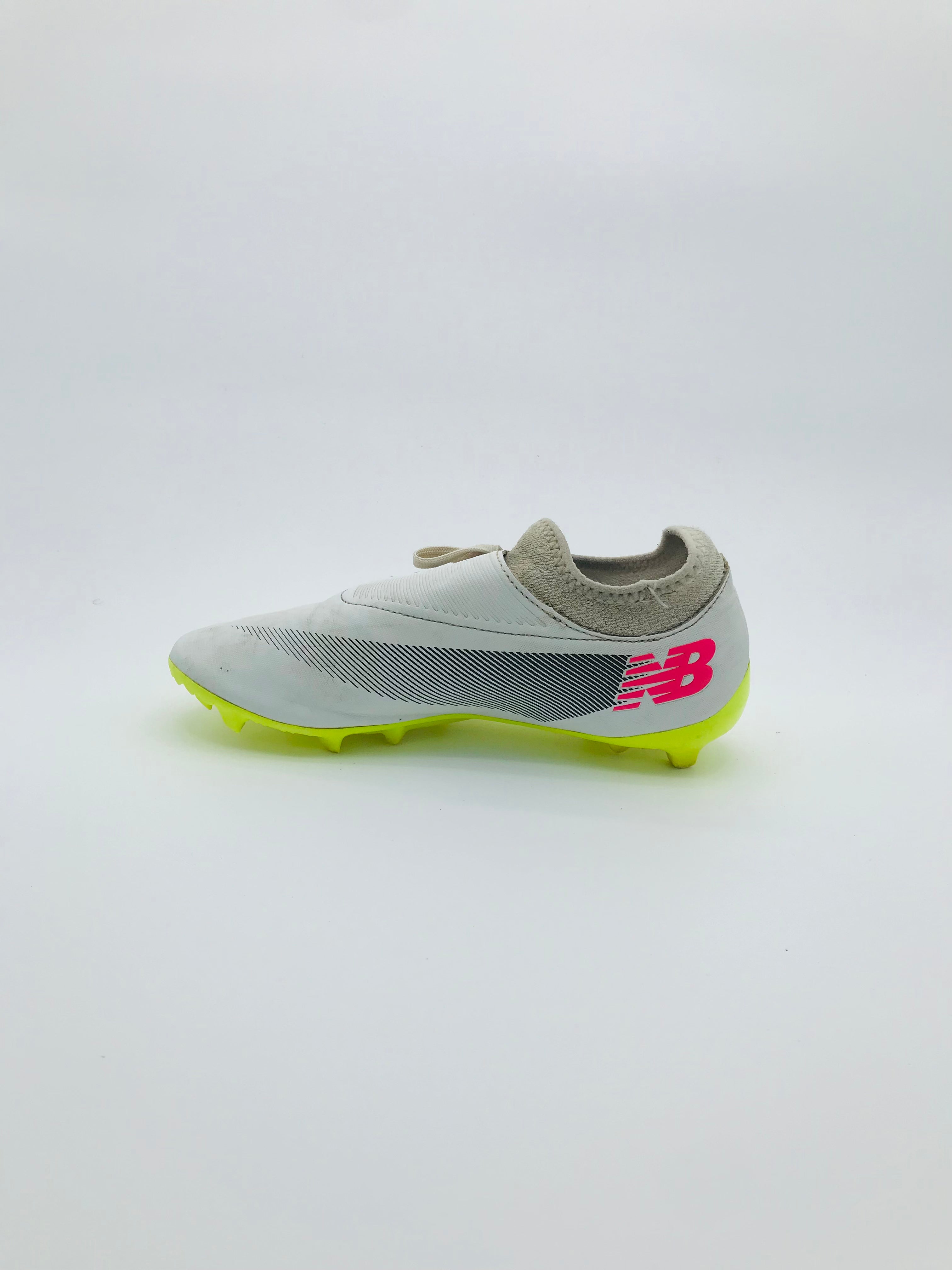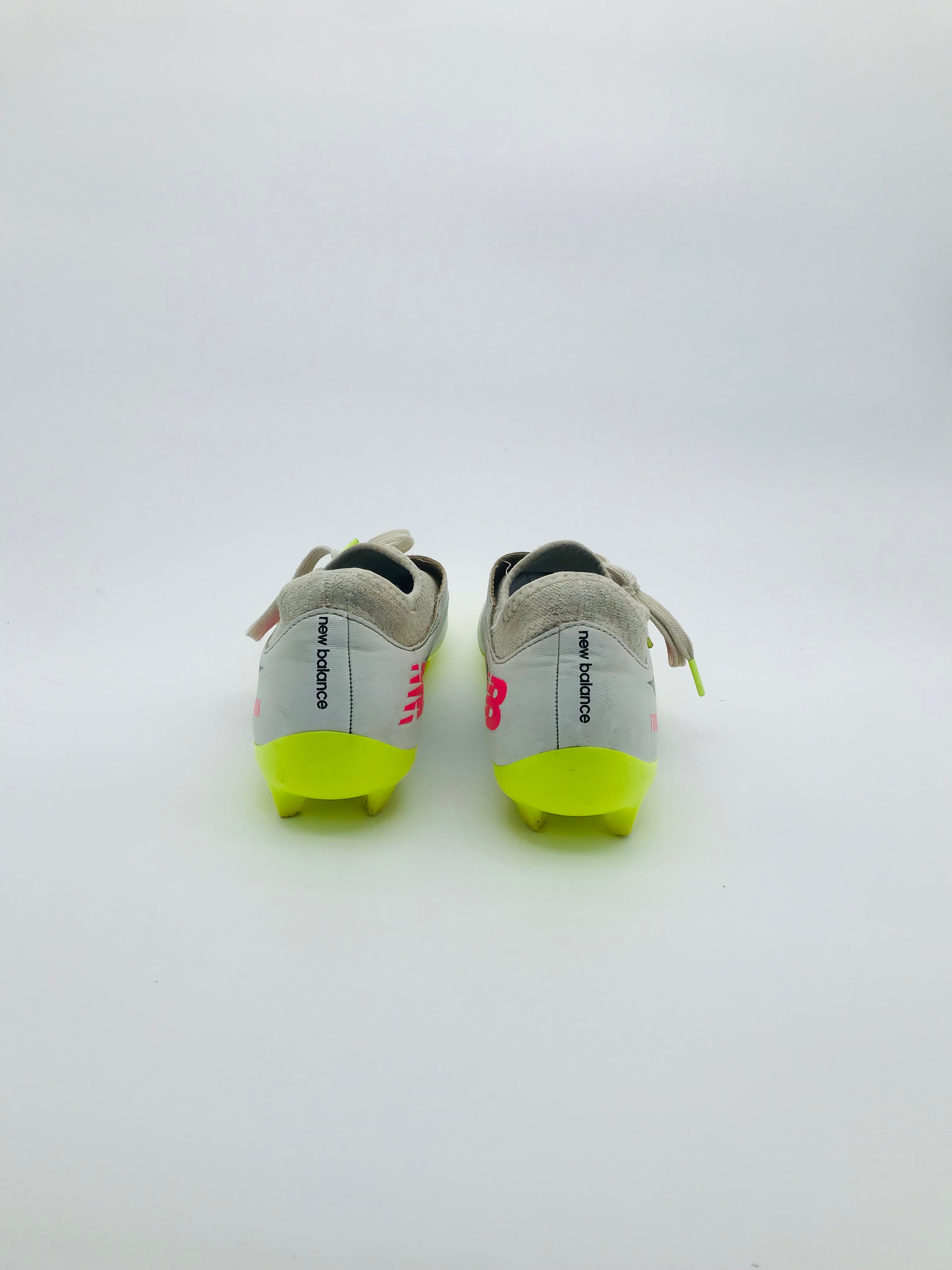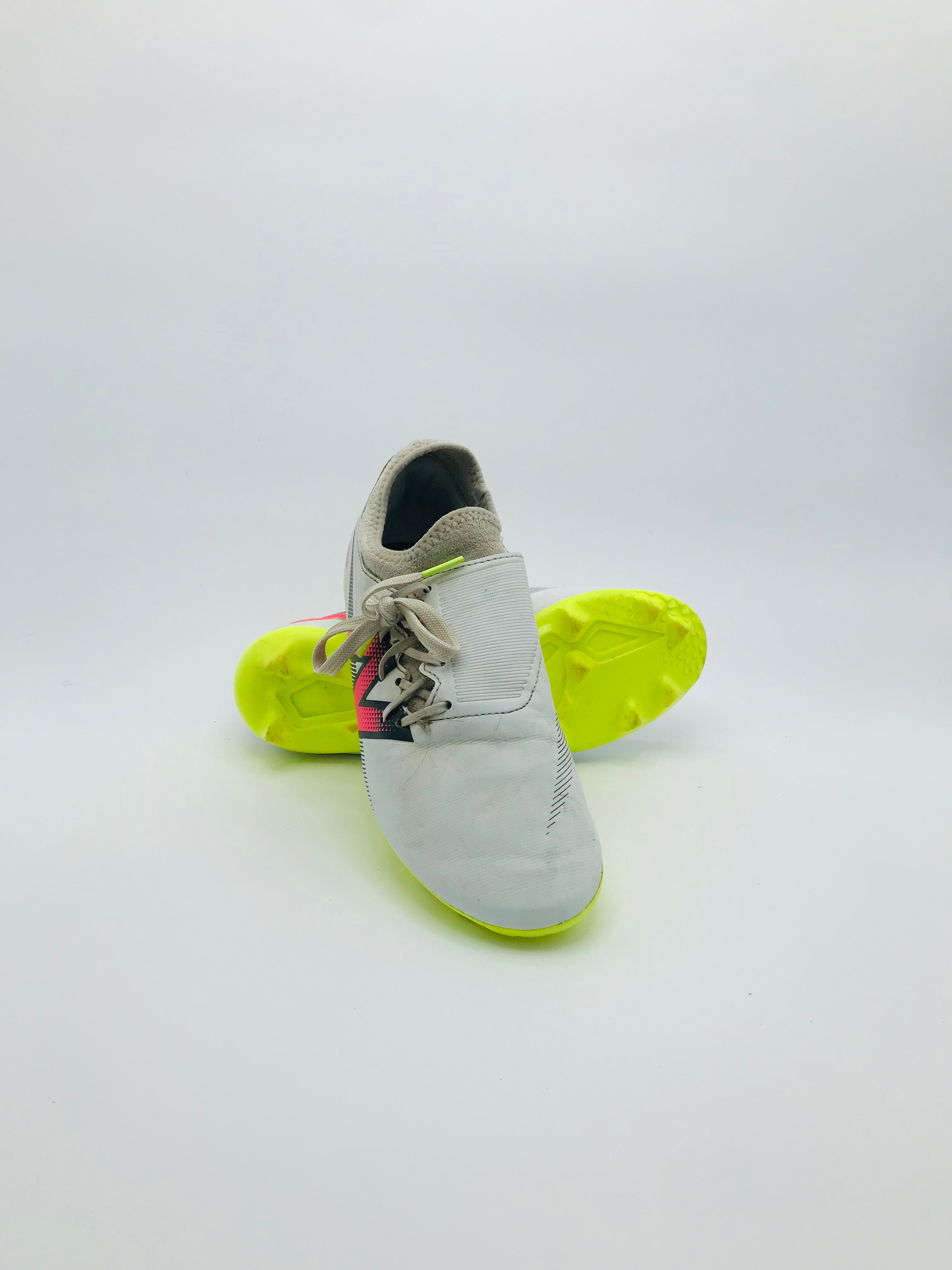 These New Balance football boots are designed for speed and agility on firm ground and artificial grass. They feature a synthetic upper for durability and a close fit. The soleplate is designed for versatile traction on multiple surfaces. Expect visible dirt, wear on the upper and soleplate, and some scuff marks due to previous use.