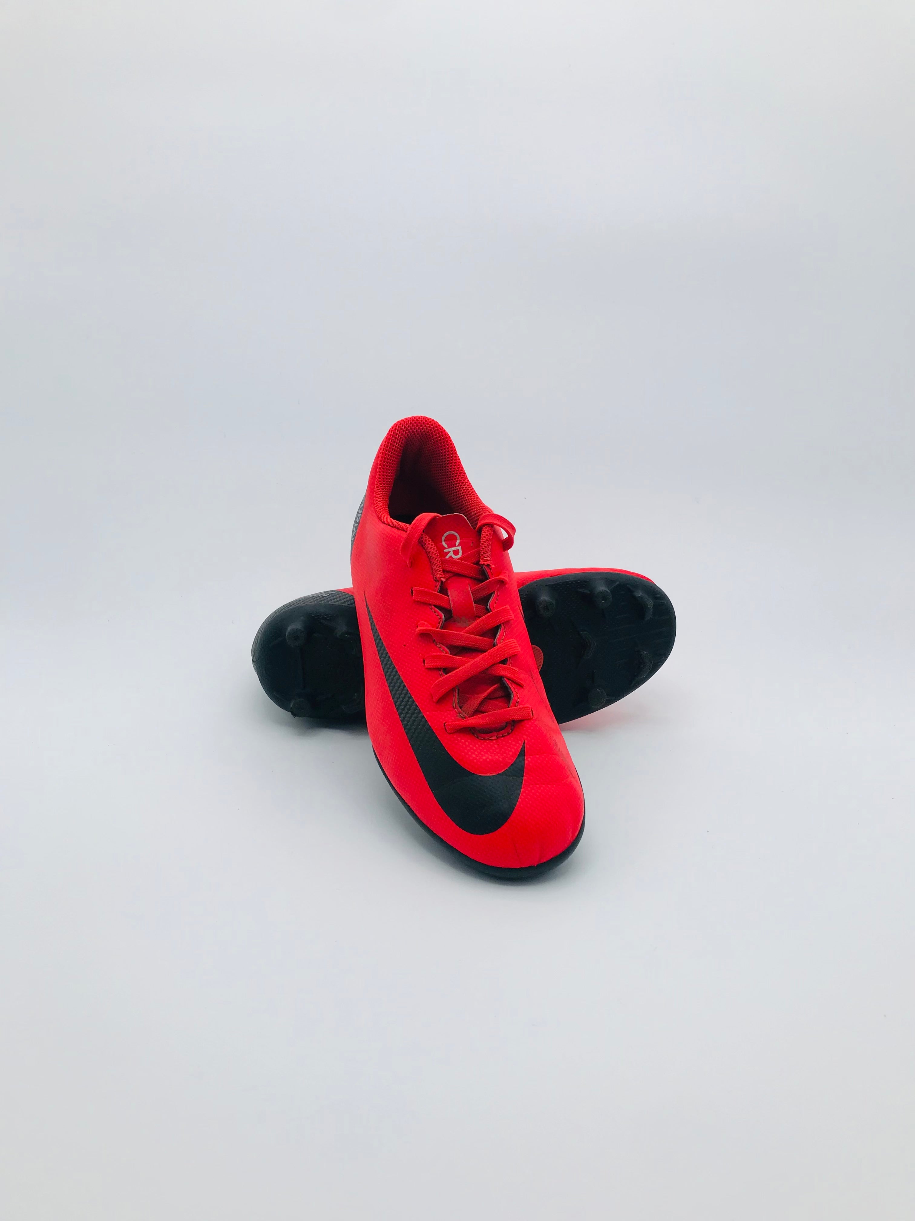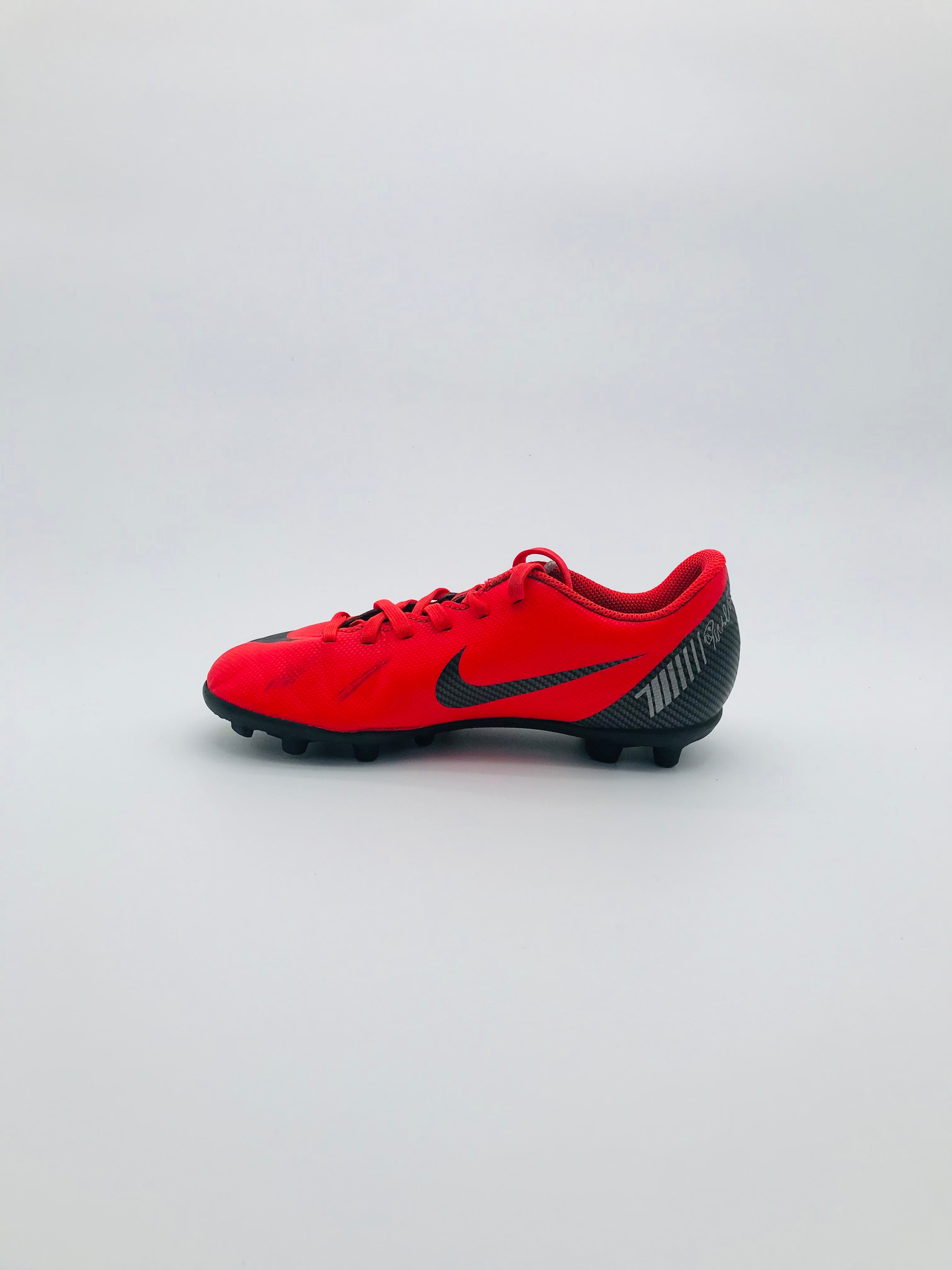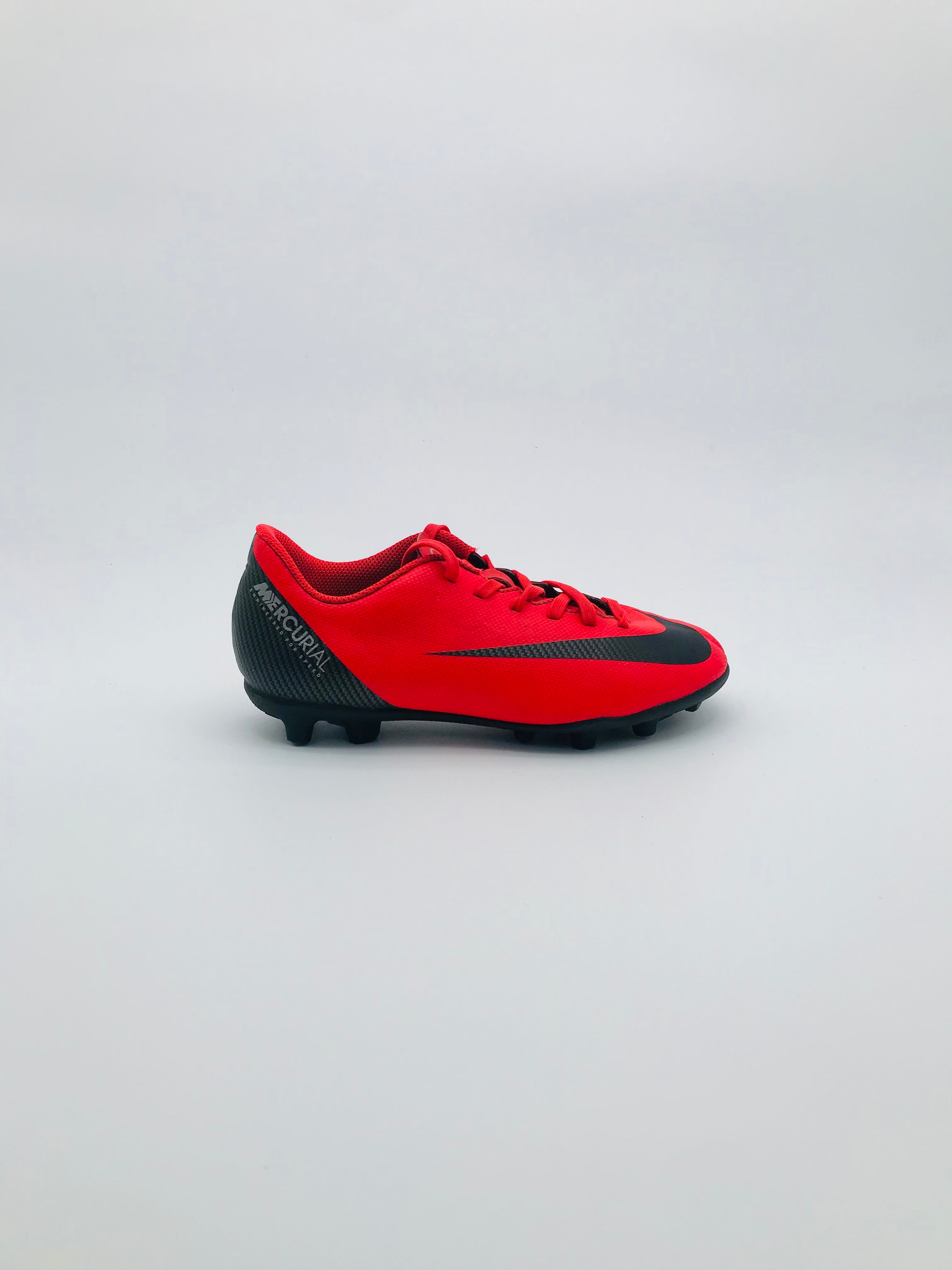 Nike Mercurial Victory VI DF CR7 FG football boots designed for speed and agility on firm ground surfaces. These boots feature a synthetic upper for durability and a Dynamic Fit collar for a secure fit. The construction aims to provide a locked-down feel and support during play. They are pre-owned in good condition with minor signs of wear, including potential scuffs on the upper and sole.