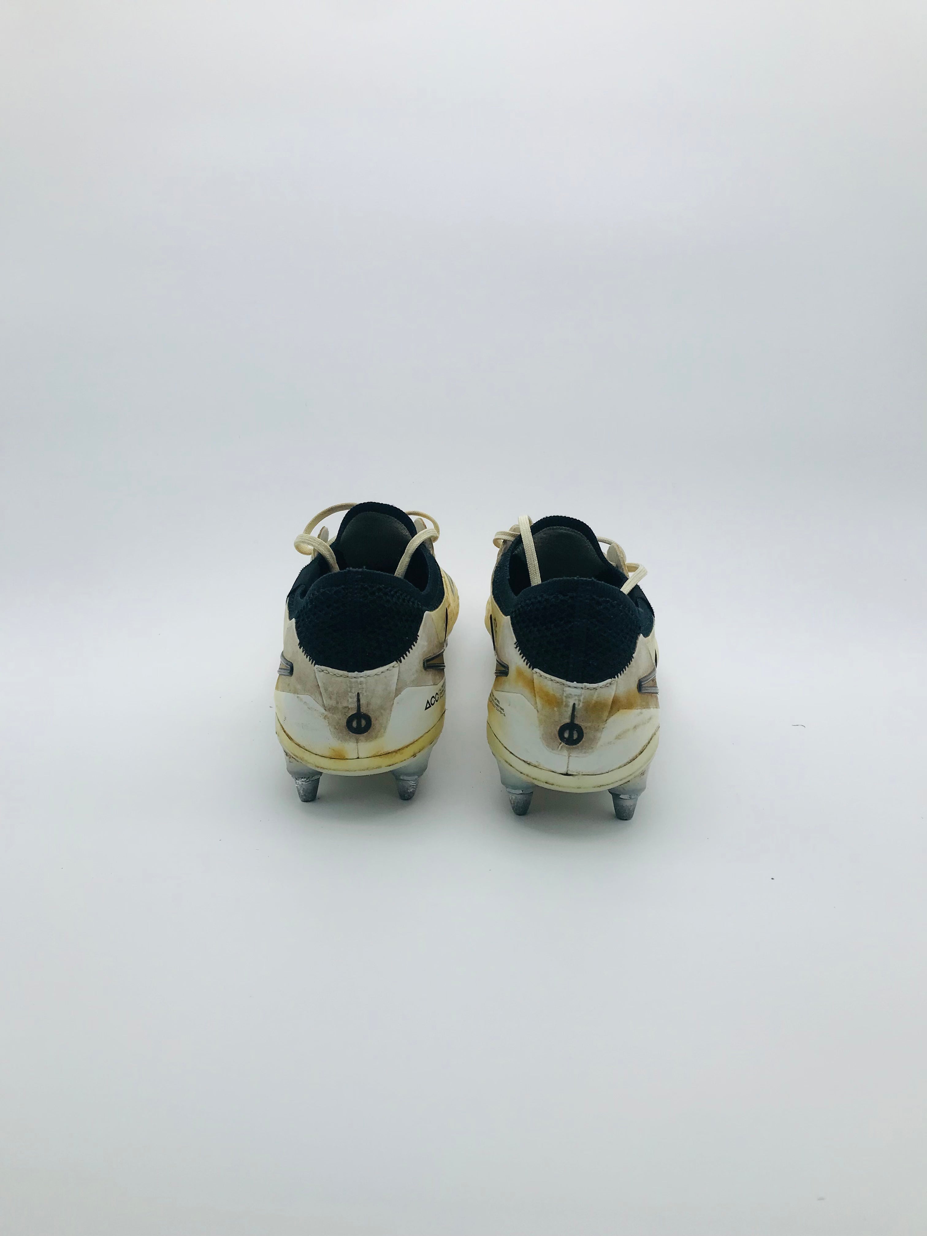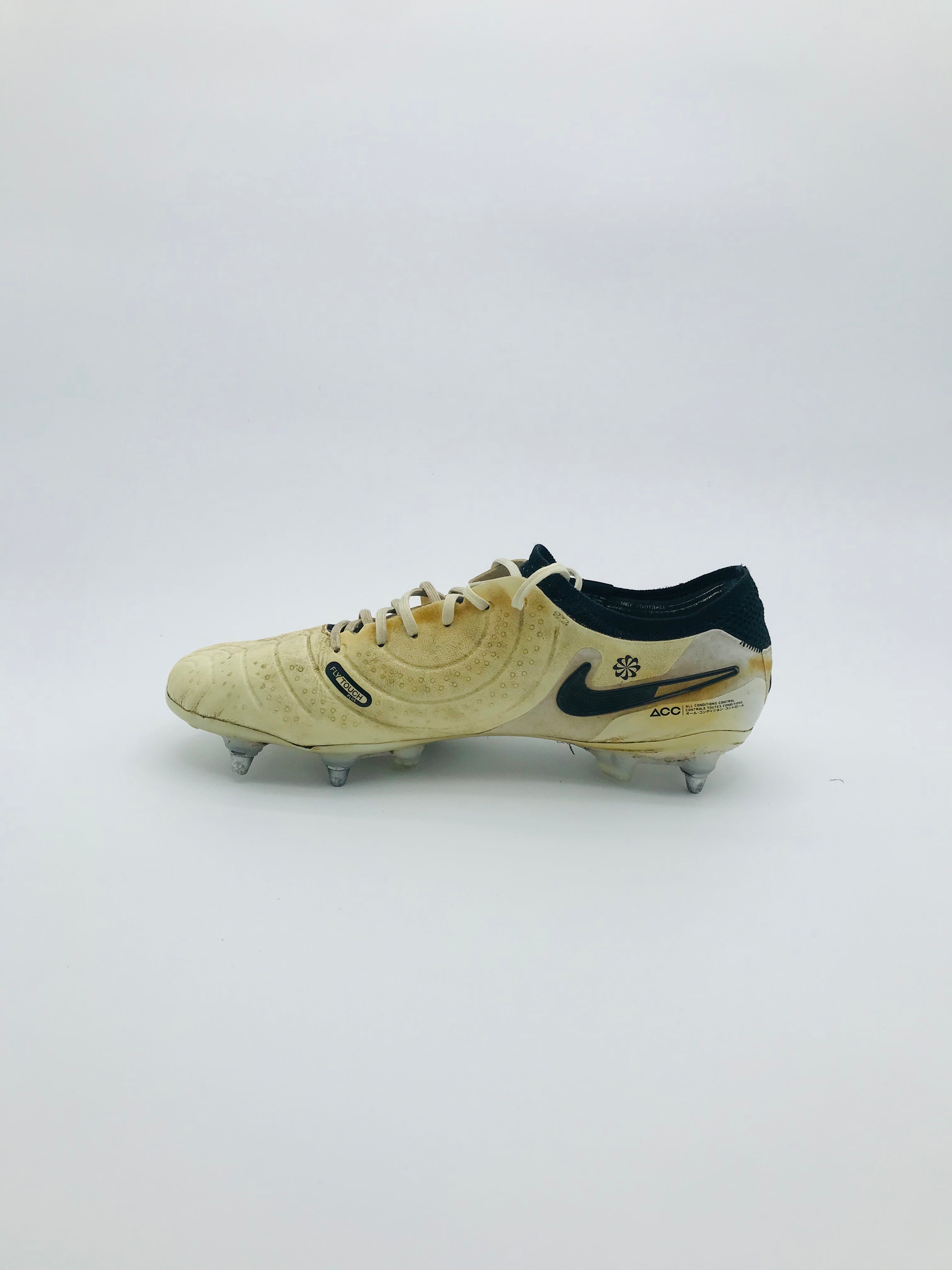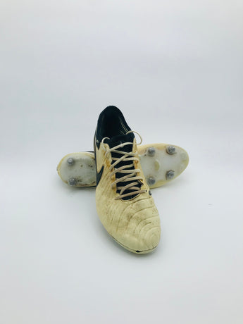 These fair-condition Nike Tiempo Legend football boots are designed for playing on grass surfaces. Constructed with a leather upper, these boots offer a classic feel. They feature metal studs for traction and a black Nike swoosh. Expect significant wear, dirt, and discoloration consistent with age and use.