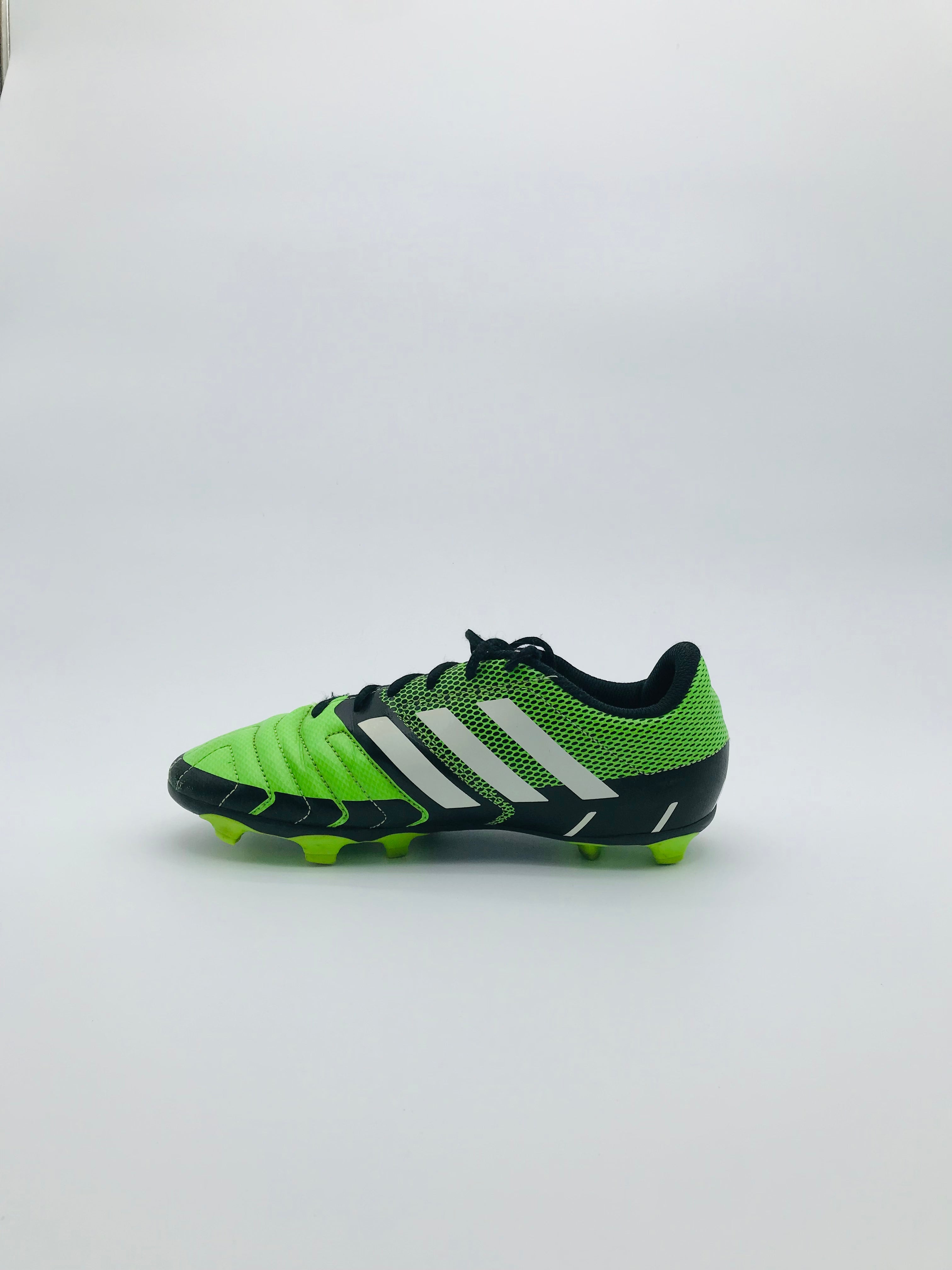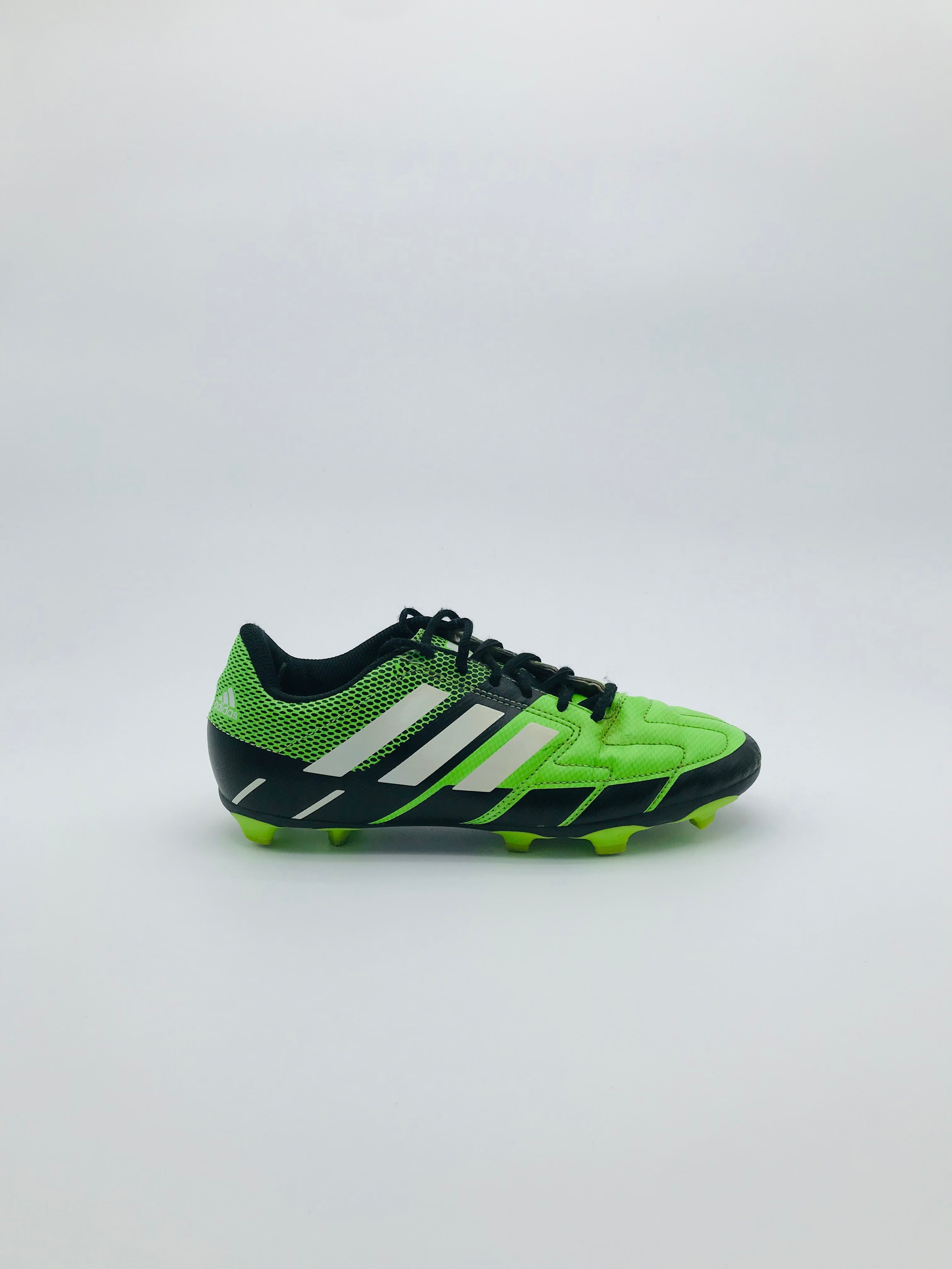 Adidas Absolado LZ TRX FG football boots designed for firm ground play. These boots feature a lightweight synthetic upper for enhanced feel and durability. The Traxion FG outsole provides reliable grip and traction on natural grass surfaces. Lime green and black colorway with Adidas 3 stripes. Signs of wear are present on the upper and soleplate, including scuff marks. Cleats appear to be in good, usable condition, though wear may occur with use.