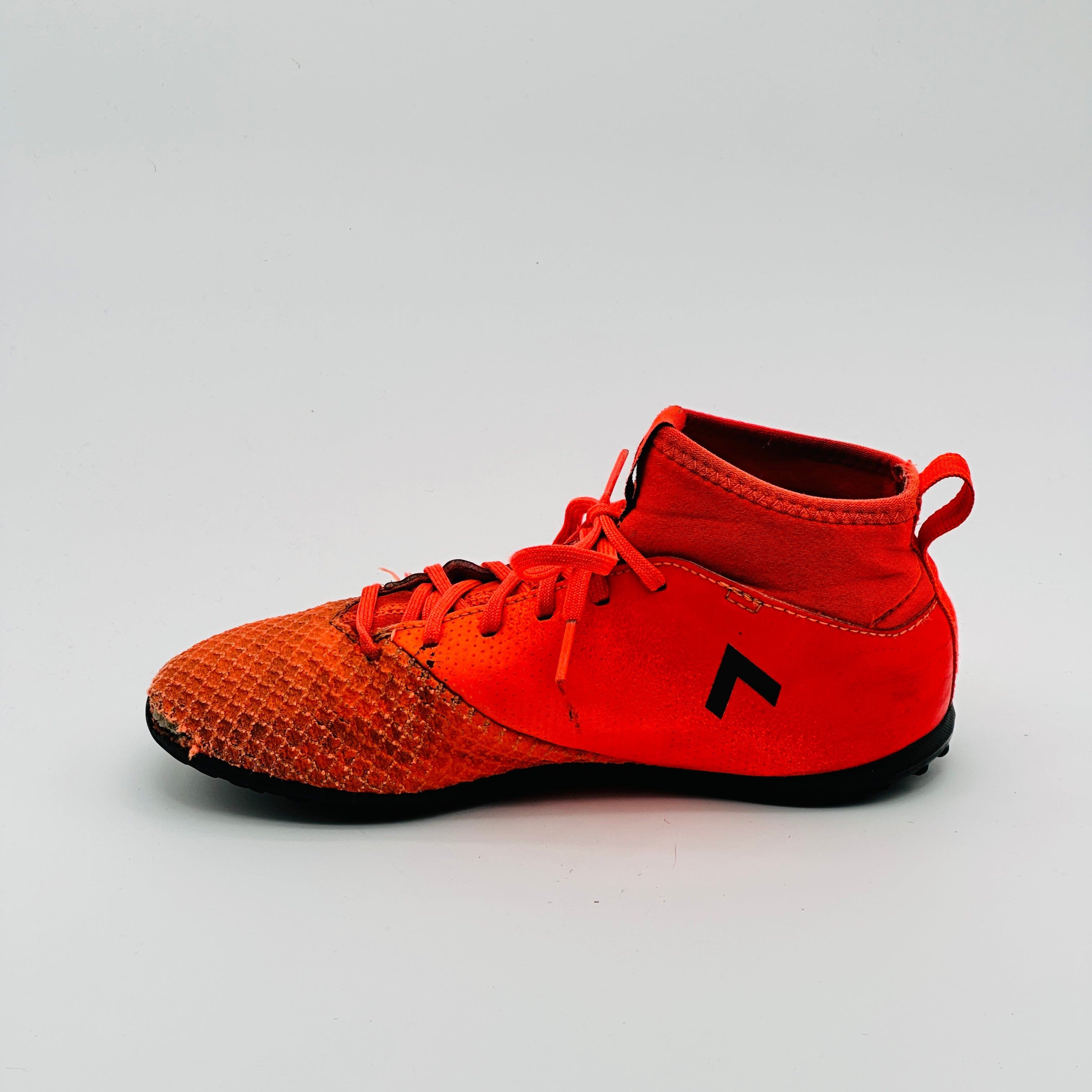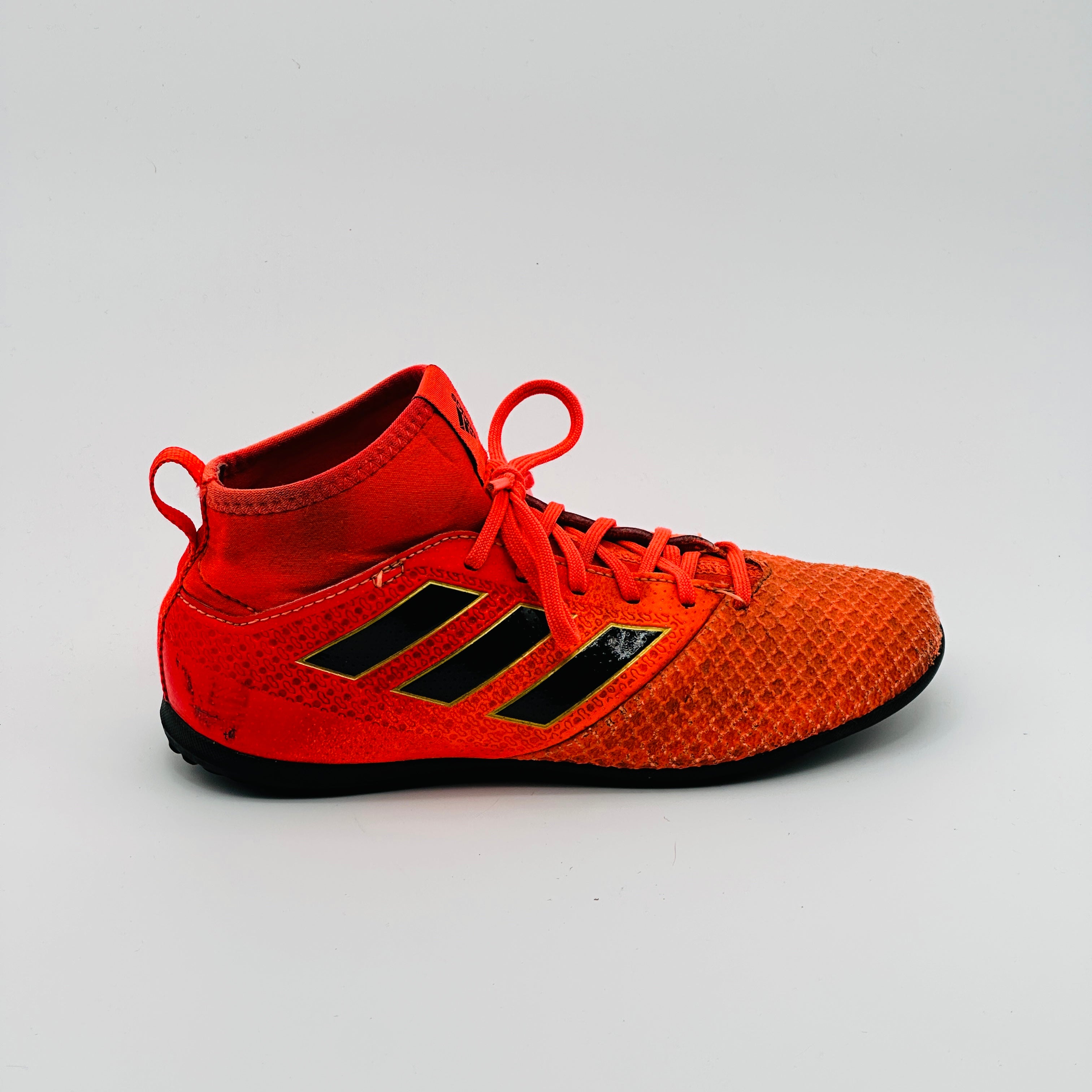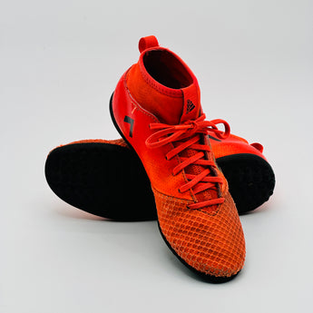 Adidas ACE Tango 17.3 TF football boots in a solar orange, core black, and solar red colorway. This model is designed for turf surfaces and features a Primemesh upper for precise ball control and a sock-like fit for stability.
